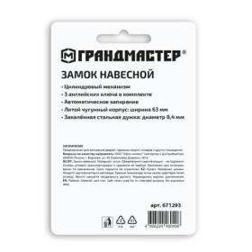 Замок навесной ГРАНДМАСТЕР с цилиндровым механизмом секретности предназначен для запирания дверей, гаражных ворот, складов и других помещений. Достаточно прост по конструкции и надёжен в повседневной эксплуатации.Замок навесной имеет литой чугунный корпус и оснащен полукруглой дужкой из закаленной стали, что делает его прочным и увеличивает сопротивляемость к взлому. Тип механизма секретности - цилиндровый. Три английских ключа в комплекте. Замок запирается автоматически (без использования ключа) при нажатии на дужку сверху, что облегчает его эксплуатацию. Средние размеры замка и толщина дужки позволяют использовать его в качестве замка для запирания дверей, гаражных ворот, складов и других помещений..