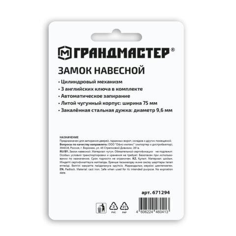 Замок навесной ГРАНДМАСТЕР с цилиндровым механизмом секретности предназначен для запирания дверей, гаражных ворот, складов и других помещений. Достаточно прост по конструкции и надёжен в повседневной эксплуатации.Замок навесной имеет литой чугунный корпус и оснащен полукруглой дужкой из закаленной стали, что делает его прочным и увеличивает сопротивляемость к взлому. Тип механизма секретности - цилиндровый. Три английских ключа в комплекте. Замок запирается автоматически (без использования ключа) при нажатии на дужку сверху, что облегчает его эксплуатацию. Большие размеры замка и толщина дужки позволяют использовать его в качестве замка для запирания дверей, гаражных ворот, складов и других помещений..