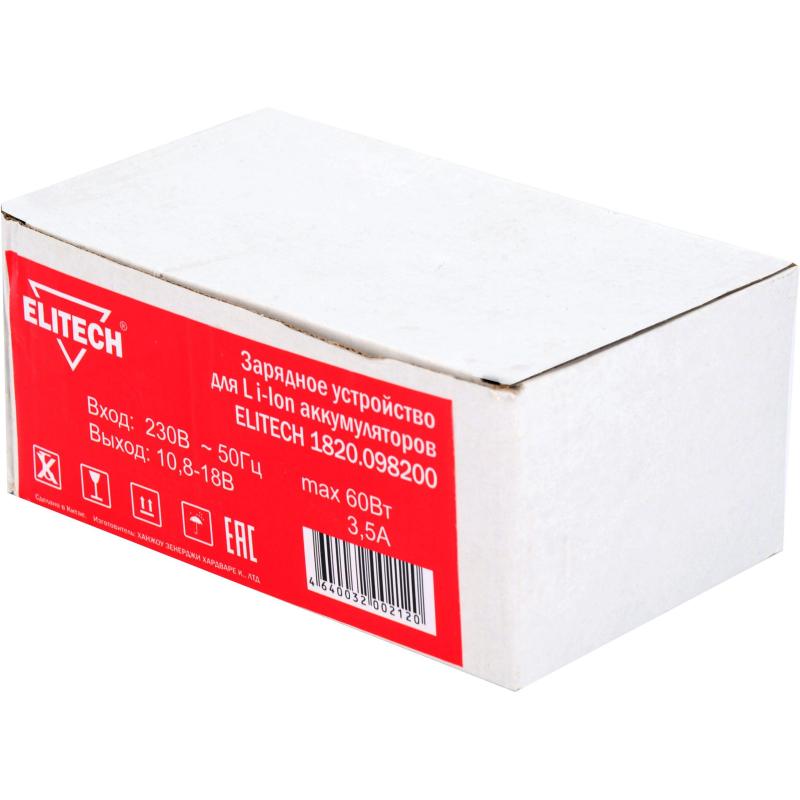 Зарядное устройство Elitech (18 В, 3.5 А, 1820.098200,192576)<br><br>Зарядное устройство Elitech 1820.098200 предназначено для зарядки Li-Ion аккумуляторов Elitech с номинальным напряжением от 10,8 до 18 В. Зарядное устройство само определяет напряжение и ёмкость установленного на зарядку аккумулятора и автоматически выбирает напряжение и ток зарядки, корректируя его в зависимости от состояния аккумулятора. Максимальный ток заряда 3,5 А. Время заряда аккумулятора от 30 до 70 минут.<br><br>Внешний вид и/или характеристики товара могут быть изменены производителем в соответствии с производственным процессом.