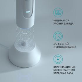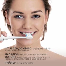 | Особенности | До 60 дней работы без подзарядки в режиме Sensitive.5 Режимов работы: Sensitive/Clean/White/Polish/Gum Care: режим Clean: 41000 пульсаций/мин, режим White: 48000 пульсаций/мин, режим Polish: 45000 пульсаций/мин, режим Gum care: 35000 пульсаций/мин, режим Sensitive: 31000 пульсаций/мин. |